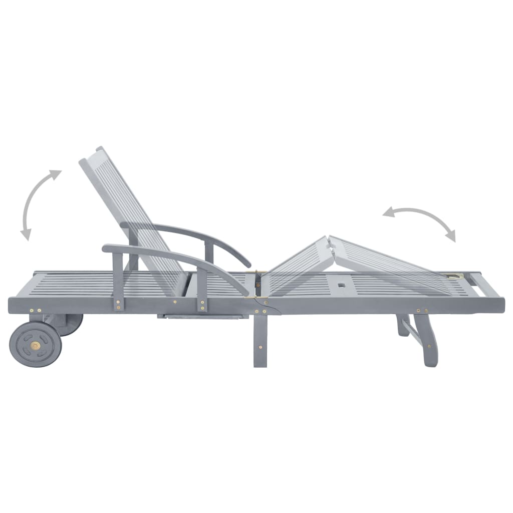 Η ξαπλώστρα εξωτερικού χώρου είναι κατασκευασμένη από μασίφ ξύλο ακακίας με γκρι φινίρισμα, που την καθιστά στιβαρή και σταθερή. Η πλάτη και το υποπόδιο μπορούν να ρυθμιστούν ώστε να επιλέξετε τη θέση που επιθυμείτε. Αυτή η ξαπλώστρα κήπου μετακινείται εύκολα με τους 2 τροχούς της. Το κρεβάτι ηλιοθεραπείας διαθέτει ένα βολικό πτυσσόμενο τραπέζι, για να ακουμπάτε το τηλέφωνο, τα γυαλιά ηλίου, ένα ρόφημα και άλλα μικροαντικείμενα Το μαξιλάρι χαρίζει επιπλέον άνεση όταν χαλαρώνετε. Κάθε μαξιλάρι διαθέτει δύο σετ σχοινιών, ώστε να μπορείτε να το στερεώσετε καλά στην ξαπλώστρα.
