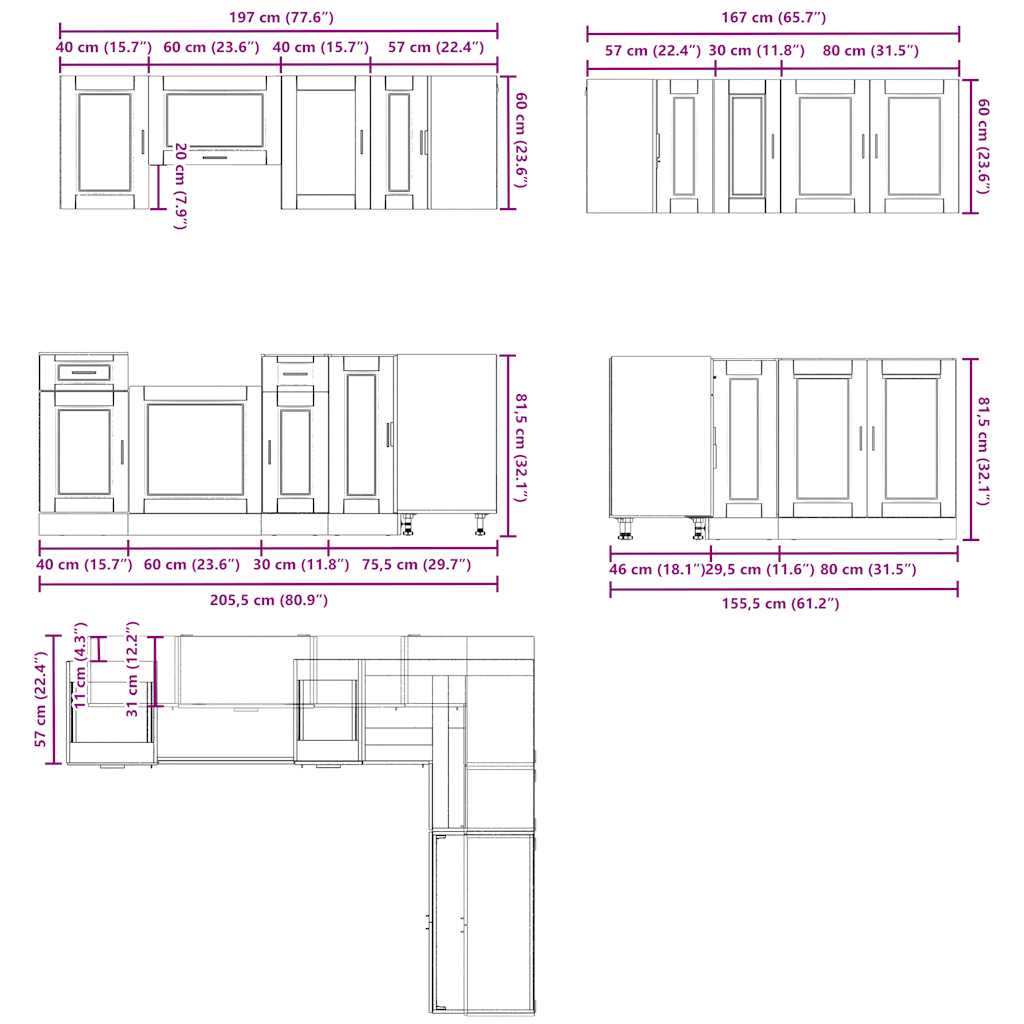 - 1 x γωνιακό ντουλάπι βάσης κουζίνας: 75,5 x 75,5 x 81,5 εκ. (Π x Β x Υ)