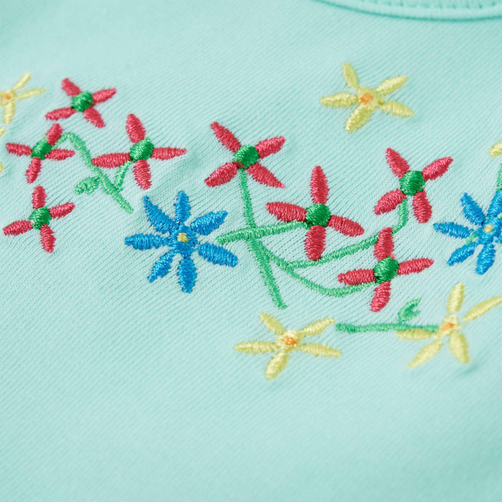 Αυτό το παιδικό μπλουζάκι έχει κοντό μανίκι, στρογγυλή λαιμόκοψη και ίσια εφαρμογή. Το παιδικό μπλουζάκι έχει λουλούδια στο μπροστινό μέρος. Το παιδικό μπλουζάκι είναι κατασκευασμένο από βαμβάκι και ελαστάνη για να είναι απαλό και άνετο.