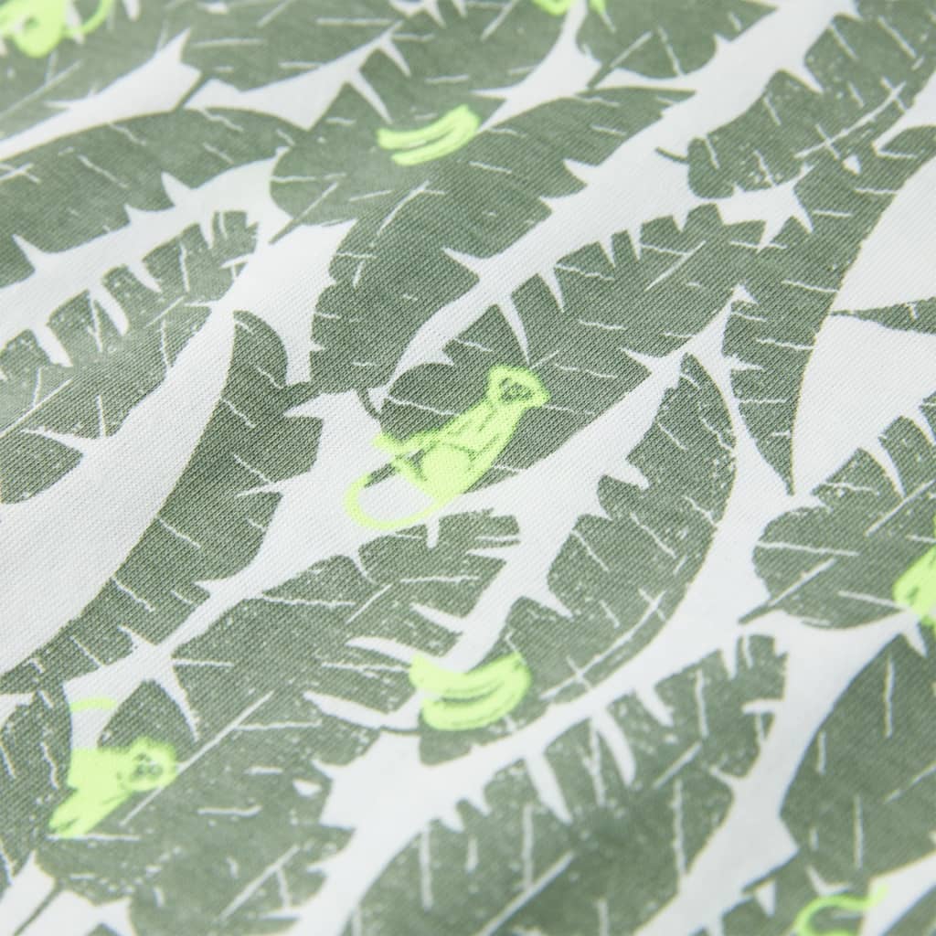 Αυτό το παιδικό μπλουζάκι έχει κοντό μανίκι, στρογγυλή λαιμόκοψη και ίσια εφαρμογή. Το παιδικό μπλουζάκι είναι τυπωμένο με φύλλα και μαϊμουδάκια σε όλη την επιφάνεια. Το παιδικό κοντομάνικο μπλουζάκι είναι κατασκευασμένο από 100% βαμβάκι για να είναι απαλό και άνετο.