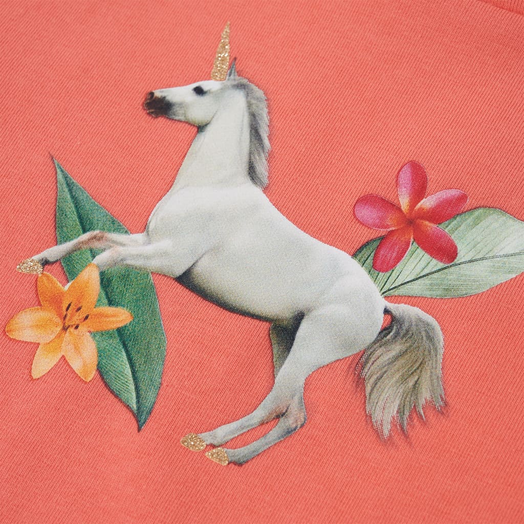 Αυτό το παιδικό μπλουζάκι έχει κοντά μανίκια με βολάν, στρογγυλή λαιμόκοψη και ίσια εφαρμογή. Αυτό το παιδικό μπλουζάκι έχει έναν όμορφο μονόκερο με φύλλα και λουλούδια. Το παιδικό κοντομάνικο μπλουζάκι είναι κατασκευασμένο από μαλακό υλικό με 95% βαμβάκι και 5% ελαστάνη για άνεση και διαπνοή.