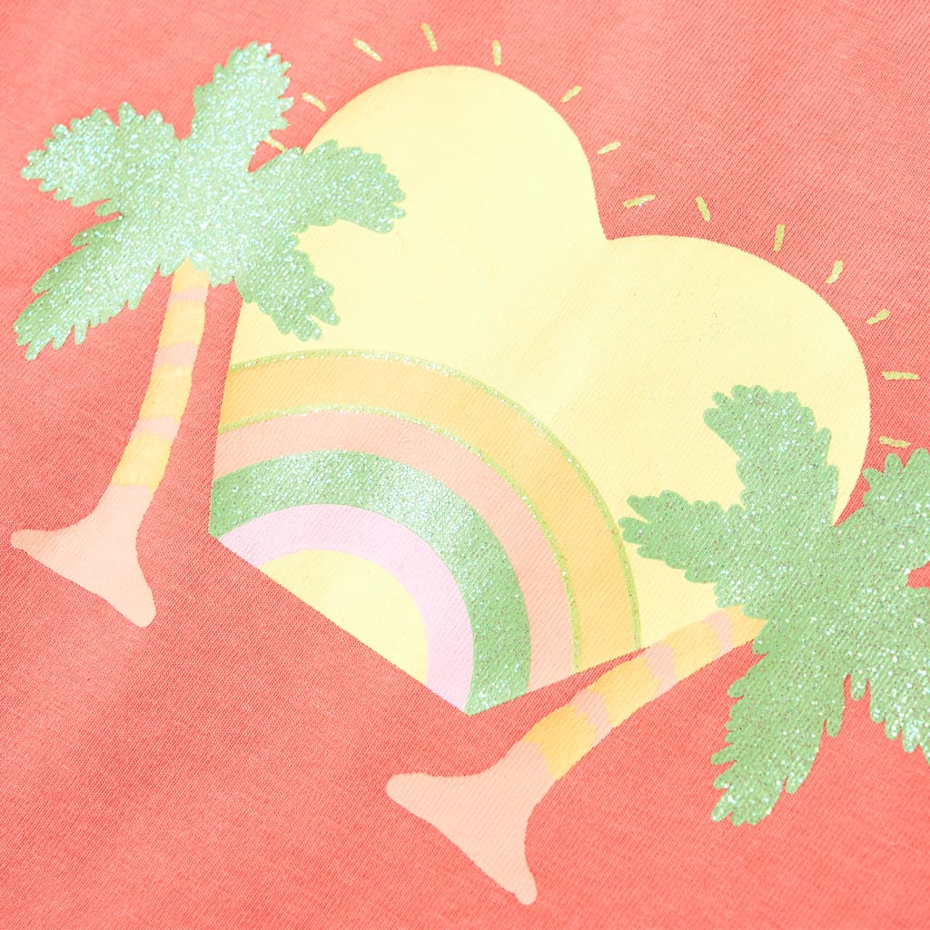 Αυτό το παιδικό μπλουζάκι έχει κοντό μανίκι, στρογγυλή λαιμόκοψη και ίσια εφαρμογή. Αυτό το μπλουζάκι έχει μια εκτύπωση με ένα ουράνιο τόξο και φοίνικες στο στήθος. Το παιδικό κοντομάνικο μπλουζάκι είναι κατασκευασμένο από 95% βαμβάκι και 5% ελαστάνη για άνεση και διαπνοή.