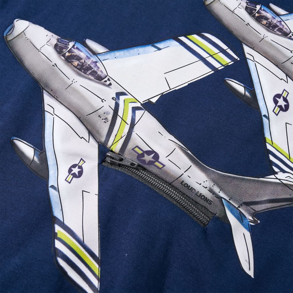 Αυτό το παιδικό μπλουζάκι έχει μακριά μανίκια, στρογγυλή λαιμόκοψη και ίσια εφαρμογή. Αυτό το μπλουζάκι σε ναυτικό μπλε χρώμα έχει σχέδιο αεροπλάνα. Το παιδικό μακρυμάνικο μπλουζάκι είναι κατασκευασμένο από 100% βαμβάκι για να είναι απαλό και άνετο.