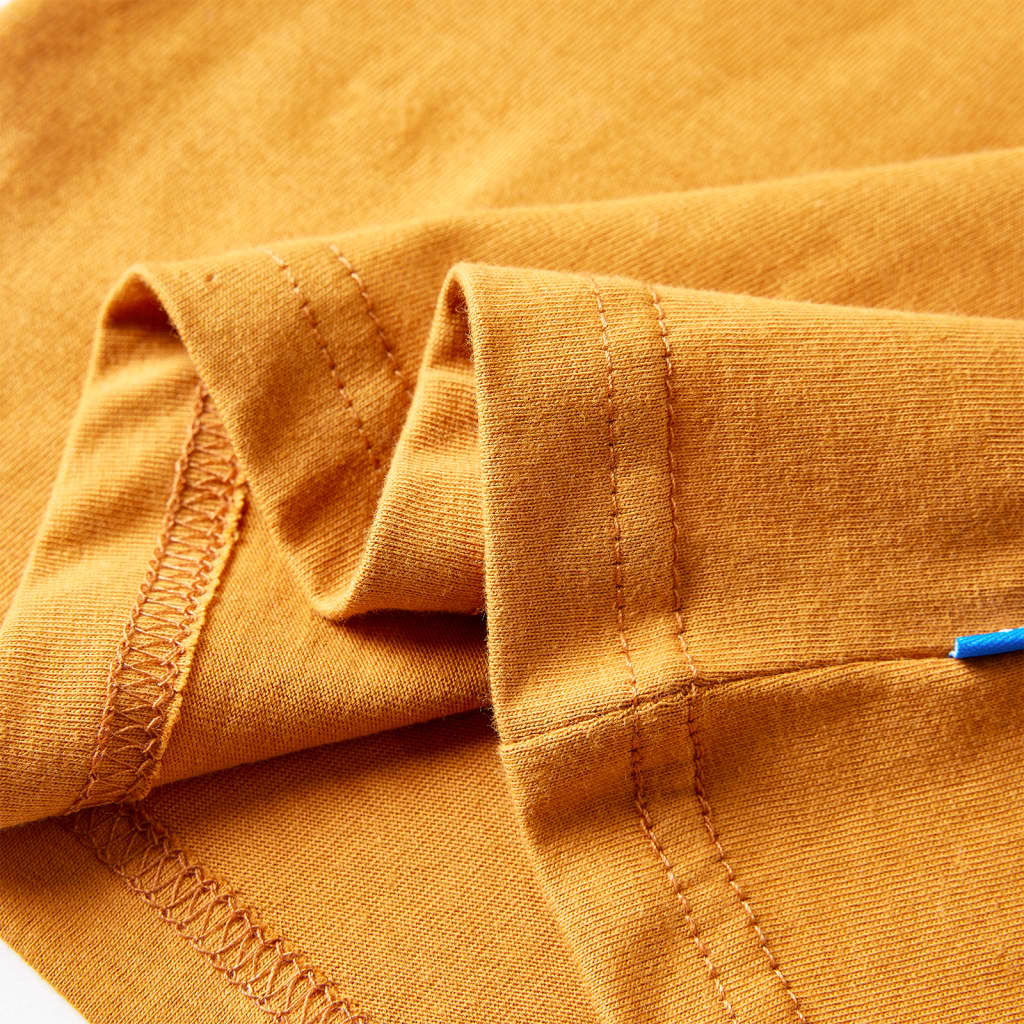 Αυτό το παιδικό μπλουζάκι έχει μακριά μανίκια, στρογγυλή λαιμόκοψη και ίσια εφαρμογή. Αυτό το μπλουζάκι σε χρώμα σκούρα ώχρα έχει σχέδιο με δεινόσαυρο. Το παιδικό μακρυμάνικο μπλουζάκι είναι κατασκευασμένο από 100% βαμβάκι που έχει υποστεί επεξεργασία με έκπλυση σε σιλικόνη και ένζυμα για να γίνει μαλακό και άνετο.