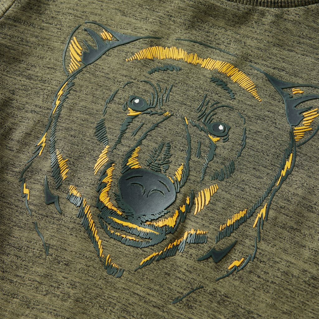 Αυτό το παιδικό μπλουζάκι έχει μακριά μανίκια, στρογγυλή λαιμόκοψη και ίσια εφαρμογή. Αυτό το χακί μελανζέ μπλουζάκι έχει σχέδιο με μια μεγάλη αρκούδα. Το παιδικό μακρυμάνικο μπλουζάκι είναι κατασκευασμένο από 100% βαμβάκι για να είναι απαλό και άνετο.