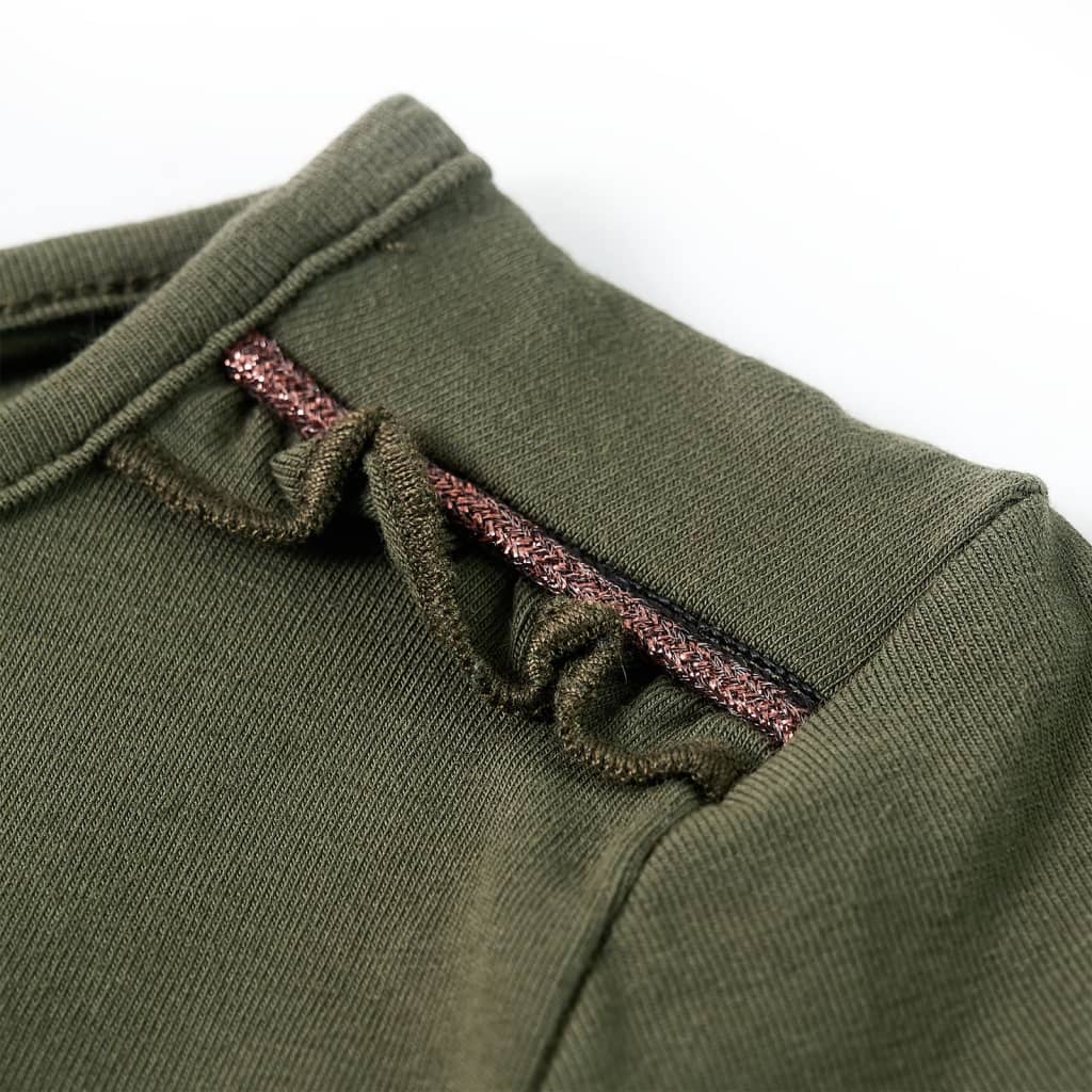 Αυτό το παιδικό μπλουζάκι έχει μακριά μανίκια, στρογγυλή λαιμόκοψη, βολάν στον ώμο και ίσια εφαρμογή. Αυτό το χακί μπλουζάκι έχει σχέδιο με χαριτωμένα ζώα. Το παιδικό μακρυμάνικο μπλουζάκι είναι κατασκευασμένο από μαλακό υλικό με 95% βαμβάκι και 5% ελαστάνη για επιπλέον άνεση και διαπνοή.