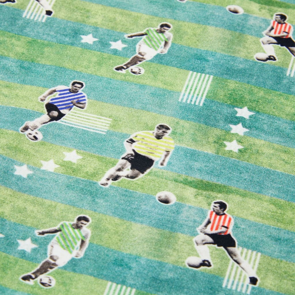 Αυτή η παιδική μπλούζα έχει μακριά μανίκια, στρογγυλή λαιμόκοψη και πλέξη λάστιχο στις μανσέτες, τη λαιμόκοψη και το κάτω μέρος. Το φούτερ είναι κατασκευασμένο από 95% βαμβάκι και 5% ελαστάνη για άνεση και διαπνοή. Η μαλακή επένδυση από φλις προσφέρει επιπλέον ζεστασιά. Το παιδικό φούτερ έχει παντού φιγούρες ποδοσφαιριστή που κλωτσάει μια μπάλα.