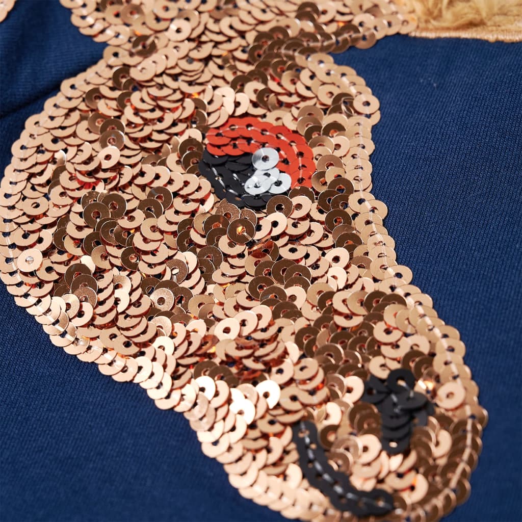 Αυτό το παιδικό φούτερ έχει μακριά μανίκια, στρογγυλή λαιμόκοψη και πλέξη ριμπ στις μανσέτες, στη λαιμόκοψη και στο κάτω μέρος. Το παιδικό μπλουζάκι έχει ένα όμορφο ναυτικό χρώμα με μια καμηλοπάρδαλη με παγιέτες στο ένα μανίκι, που προσθέτει έξτρα διασκέδαση. Το πουλόβερ είναι κατασκευασμένο από 95% βαμβάκι και 5% ελαστάνη για άνεση και διαπνοή. Η απαλή φλις επένδυση παρέχει επιπλέον ζεστασιά.
