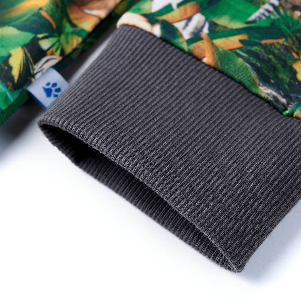 Αυτό το παιδικό φούτερ έχει μακριά μανίκια, στρογγυλή λαιμόκοψη και πλέξη ριμπ στις μανσέτες, στη λαιμόκοψη και στο κάτω μέρος. Αυτό το παιδικό φούτερ έχει τυπωμένα ζώα και φυτά σε όλη την επιφάνεια. Το παιδικό φούτερ είναι κατασκευασμένο από μαλακό υλικό που περιλαμβάνει 95% βαμβάκι και 5% ελαστάνη για άνεση και διαπνοή.