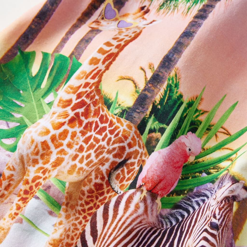 Αυτό το αμάνικο παιδικό φόρεμα έχει στρογγυλή λαιμόκοψη και κλείνει με κρυφό φερμουάρ στο πίσω μέρος. Αυτό το κοραλλί παιδικό φόρεμα έχει τυπωμένο τροπικό τοπίο και ζώα μπροστά. Το κοντό παιδικό φόρεμα έχει κορδόνια στο πίσω μέρος που μπορούν να σφίξουν στο πλάι, κάνοντας το φόρεμα να εφαρμόζει καλύτερα στη μέση χωρίς να είναι πολύ στενό. Το κοντό παιδικό φόρεμα είναι κατασκευασμένο από μαλακό υλικό που περιλαμβάνει βαμβάκι και ελαστάνη για άνεση και διαπνοή.