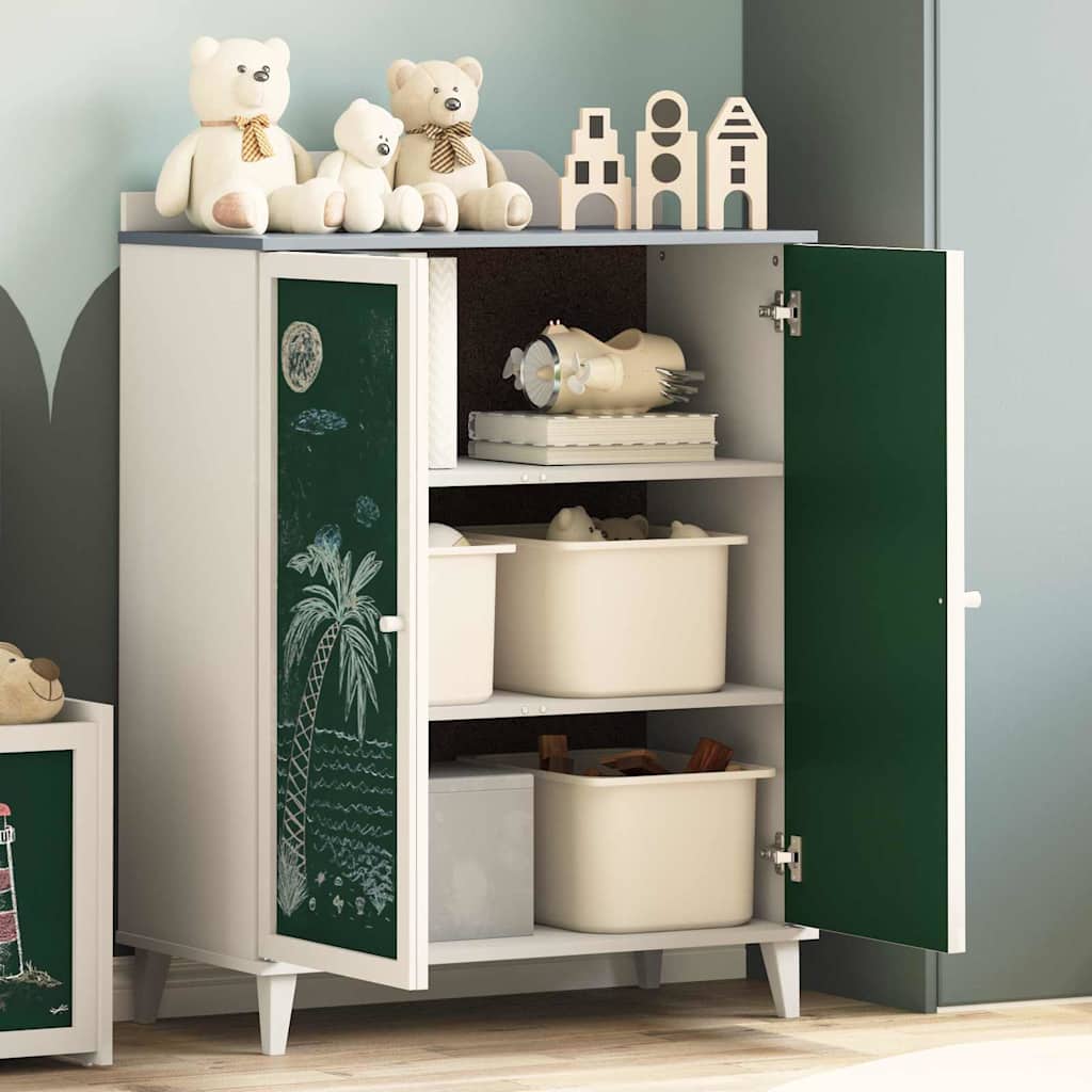 Αυτός ο μοντέρνος μπουφές με μαυροπίνακα συνδυάζει στυλ και λειτουργικότητα, κάνοντάς τον ιδανική επιλογή για παιδικά δωμάτια ή καθιστικά. Το ορθογώνιο σχέδιο και η κομψή του εμφάνιση προσθέτουν μια μοντέρνα αίσθηση, με το λευκό πλαίσιο και τις ζωντανές πράσινες πόρτες να ενισχύουν την αισθητική. Ιδανικός για αποθήκευση και δημιουργία, μπορεί να χρησιμοποιηθεί και ως μαυροπίνακας για προσωπικές σημειώσεις ή καλλιτεχνικές δημιουργίες.
