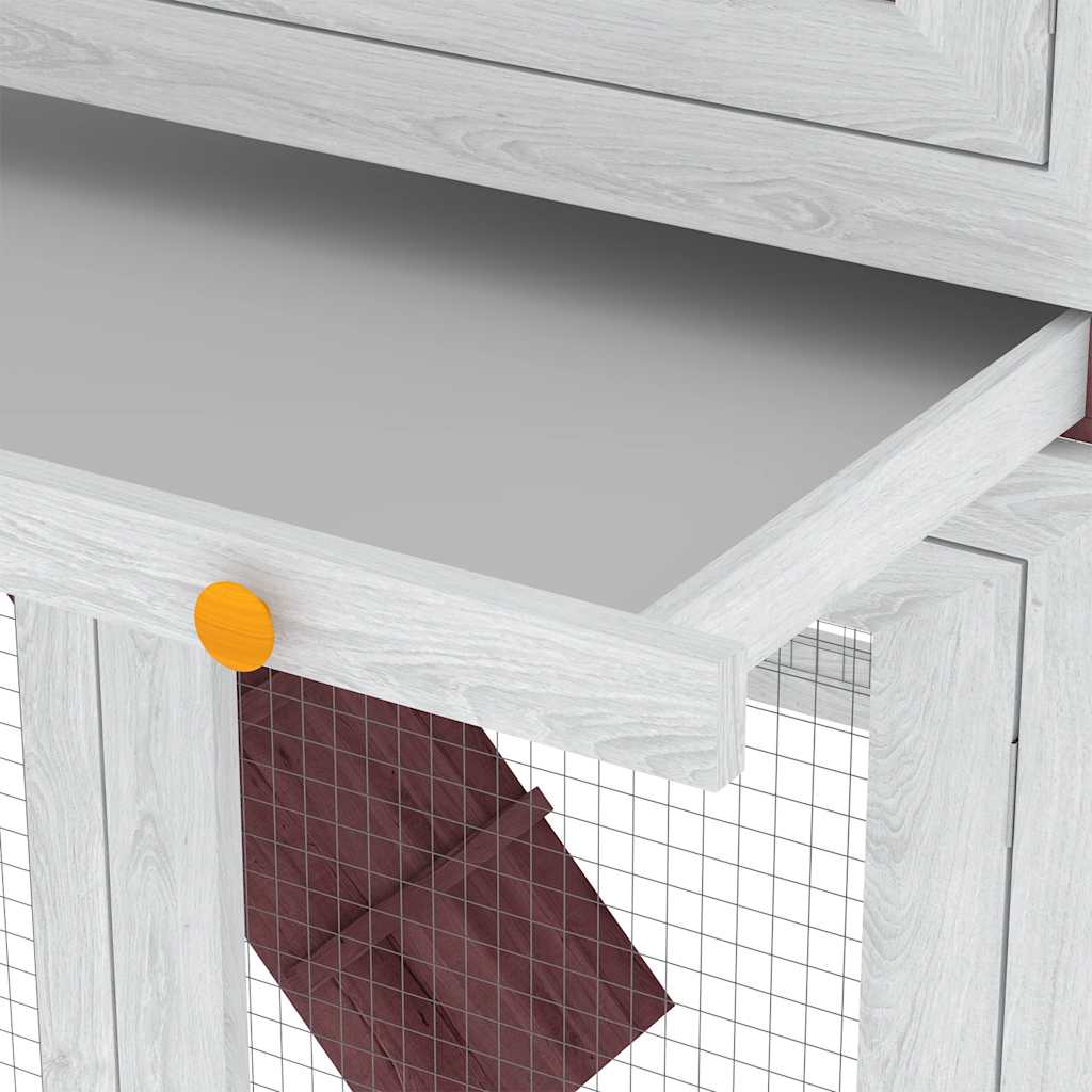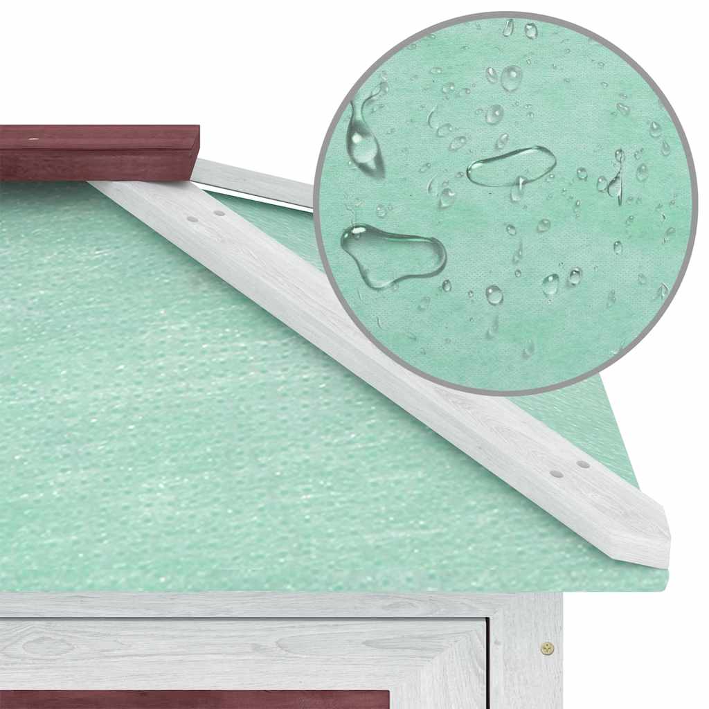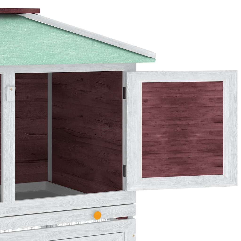 Το κλουβί ζώων διαθέτει σκελετό από ξύλο ελάτης, που θα του επιτρέψει να διαρκέσει χρόνια. Η πράσινη στέγη του δεν επιτρέπει την είσοδο της βροχής στο κλουβί, ενώ διαθέτει και ένα άνετο δωματιάκι που θα είναι μια εξαιρετική περιοχή ύπνου. Η σκάλα του βοηθά την εύκολη ανάβαση από το χαμηλότερο επίπεδο στον επάνω όροφο. Ο δίσκος που ανοίγει προς τα έξω καθιστά το καθάρισμα εύκολο και οι πόρτες κλείνουν με ευκολία. Αυτό το ξύλινο κλουβί κουνελιών είναι ιδανικό για μικρά κατοικίδια.