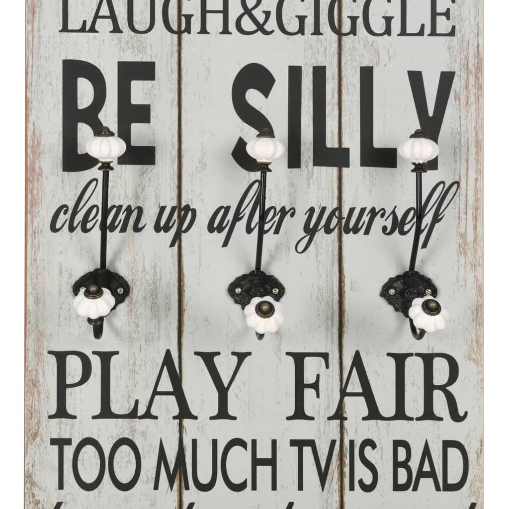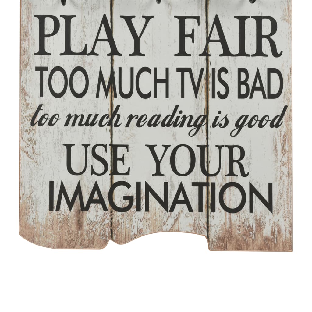 Χάρις στη vintage επιγραφή «Play room rules - Ignore mean ones - Thank you - Be silly - Play fair - Use your imagination», αυτή η επιτοίχια κρεμάστρα ρούχων με 6 γάντζους θα τραβήξει αμέσως τα βλέμματα των επισκεπτών σας.