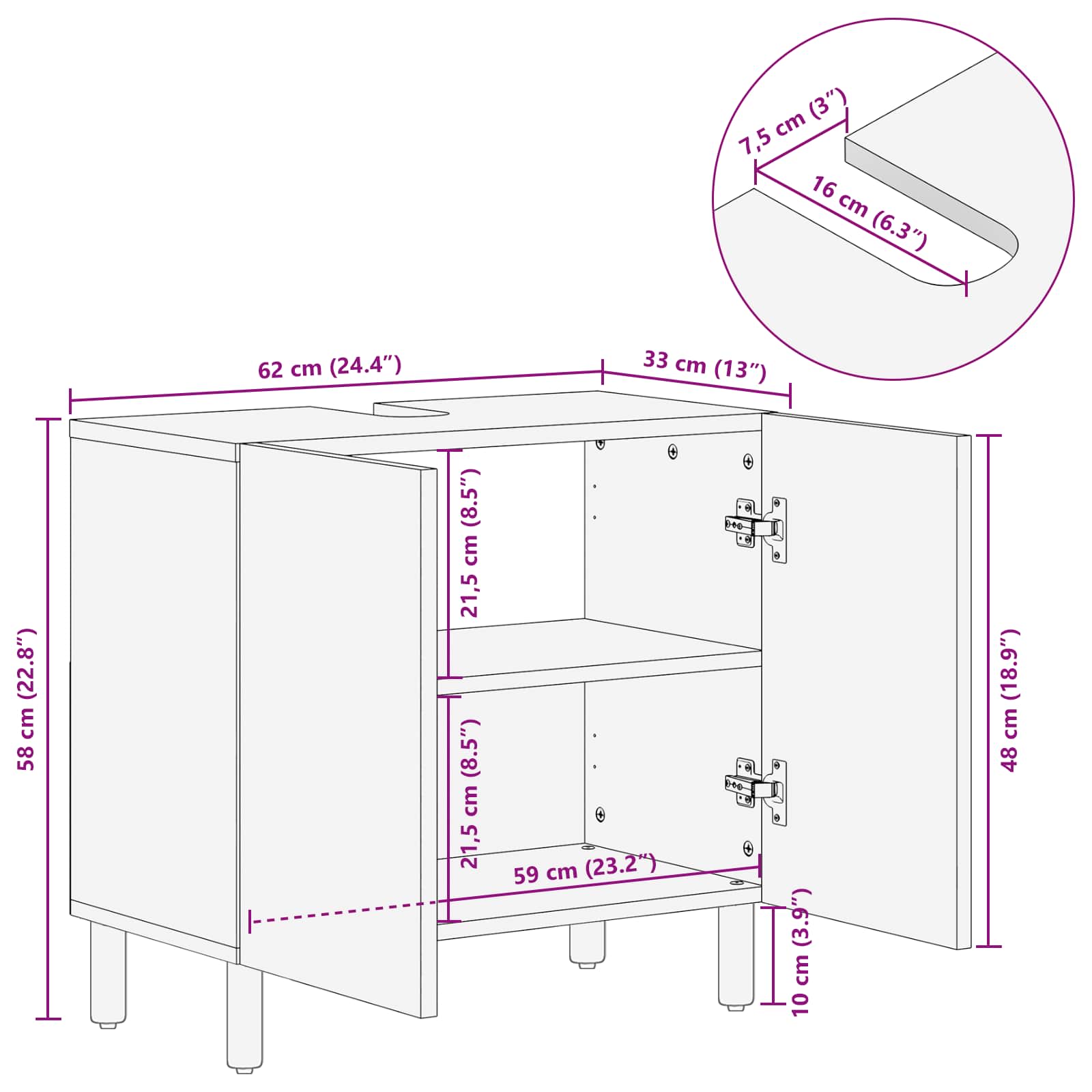 Αυτή η σύγχρονη νιπτήρας ντουλάπα είναι η τέλεια ένωση λειτουργικότητας και στυλ, φτιαγμένη από μασίφ ξύλο μάνγκο. Με διαστάσεις 62 x 33 x 58 εκ, μπορεί να τοποθετηθεί παντού στο μπάνιο, ιδανική για όσους εκτιμούν την ομορφιά στον απλό σχεδιασμό. Το ορθογώνιο σχήμα της την καθιστά τέλεια για στενές περιοχές, δημιουργώντας μια αρμονία που κάνει το μπάνιο σας να φαίνεται πιο ευρύχωρο. Σχεδιασμένη για να καλύπτει όλες τις ανάγκες του μπάνιου, αυτή η ντουλάπα προσφέρει πρακτικές λύσεις μόλις τη χρειαστείτε.