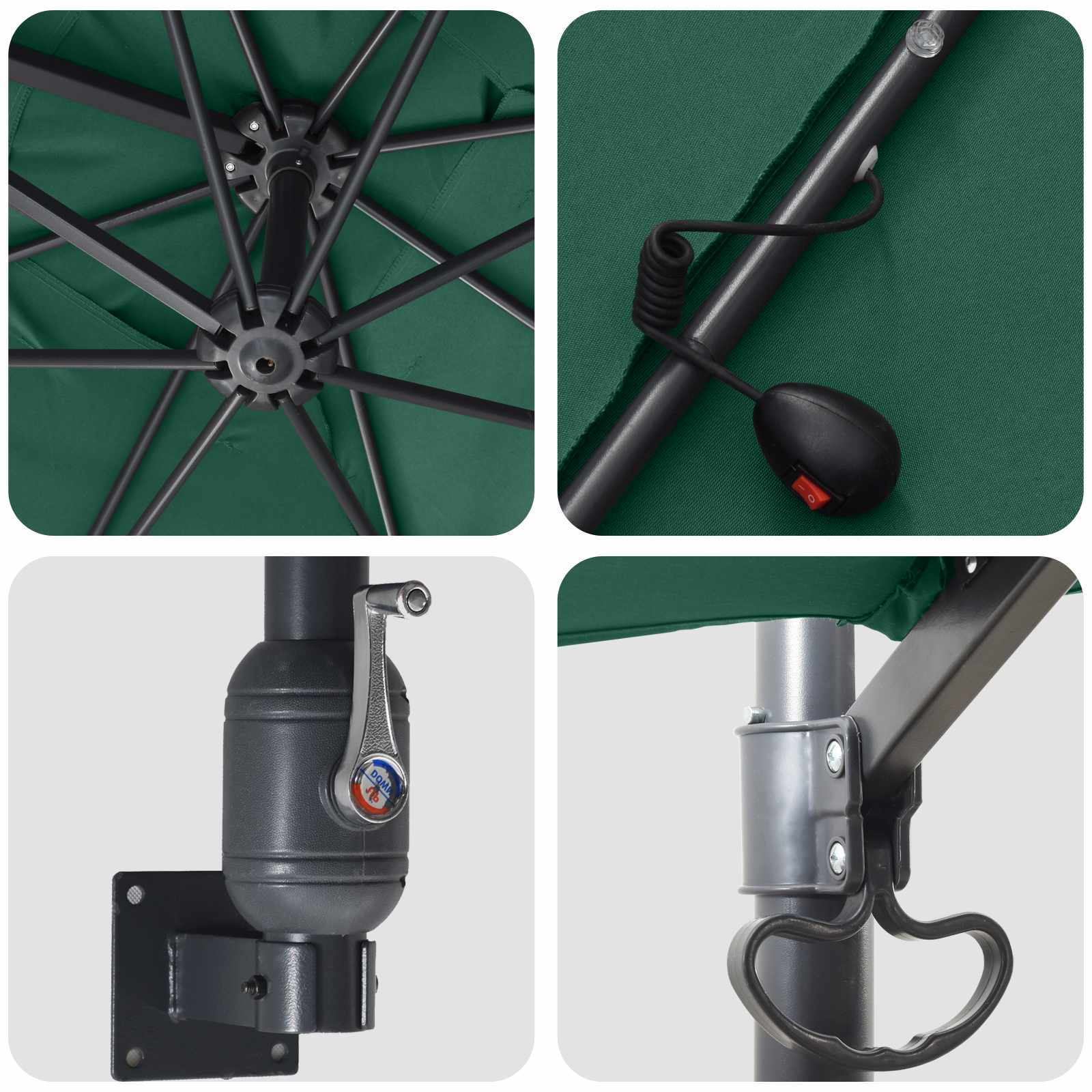 - Φωτισμός LED: Δώστε ζωή στις βραδιές σας με τα ενσωματωμένα φώτα LED κάτω από την ομπρέλα. Λειτουργούν με ηλιακή ή μπαταρία και δημιουργούν μια όμορφη ατμόσφαιρα για περισσότερη διασκέδαση.
