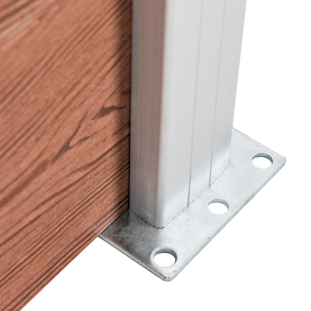 Αυτός ο φράχτης από WPC διαθέτει σχέδιο νερών ξύλου από τη μια πλευρά και κανονικό σχέδιο από την άλλη πλευρά, ώστε να επιλέξετε ποιο σχέδιο προτιμάτε. Το πάνελ περίφραξής μας από ξυλο-πλαστικό σύνθετο δεν απαιτεί καμία επιπλέον επεξεργασία όπως βερνίκωμα ή βαφή. Είναι πολύ ανθεκτικό και αντιστέκεται στη μούχλα και τη σκουριά. Χάρις στο προφίλ αλουμινίου επάνω μέρους, οι σανίδες περίφραξης μπορούν να συνδεθούν σφικτά μεταξύ τους, γεγονός που αυξάνει την δύναμη και την αντοχή τους απέναντι στα χτυπήματα. Χάρις στο αρθρωτό τους σύστημα, τα πάνελ περίφραξης εγκαθίστανται εύκολα και σας επιτρέπουν να επεκτείνετε τον φράχτη ελεύθερα. Οι στύλοι είναι εξοπλισμένοι με τρεις εγκοπές που σας βοηθούν να συναρμολογήσετε τον φράχτη με διαφορετικούς τρόπους, όπως σε ευθεία γραμμή (180 μοίρες), σε ορθή γωνία (90 μοίρες) ή σε σχήμα «Τ». Τα πολυλειτουργικά ατσάλινα πόδια μπορούν να στερεωθούν με δύο τρόπους. Ο πρώτος είναι να βιδωθούν επάνω σε μια επιφάνεια, χρησιμοποιώντας τις παρεχόμενες βίδες στερέωσης. Ο δεύτερος τρόπος είναι να τα στερεώσετε σε μια βάση τσιμέντου, χρησιμοποιώντας το στήριγμα εδάφους (δεν περιλαμβάνεται). Αυτό το σετ φράχτη συναρμολογείται εύκολα.