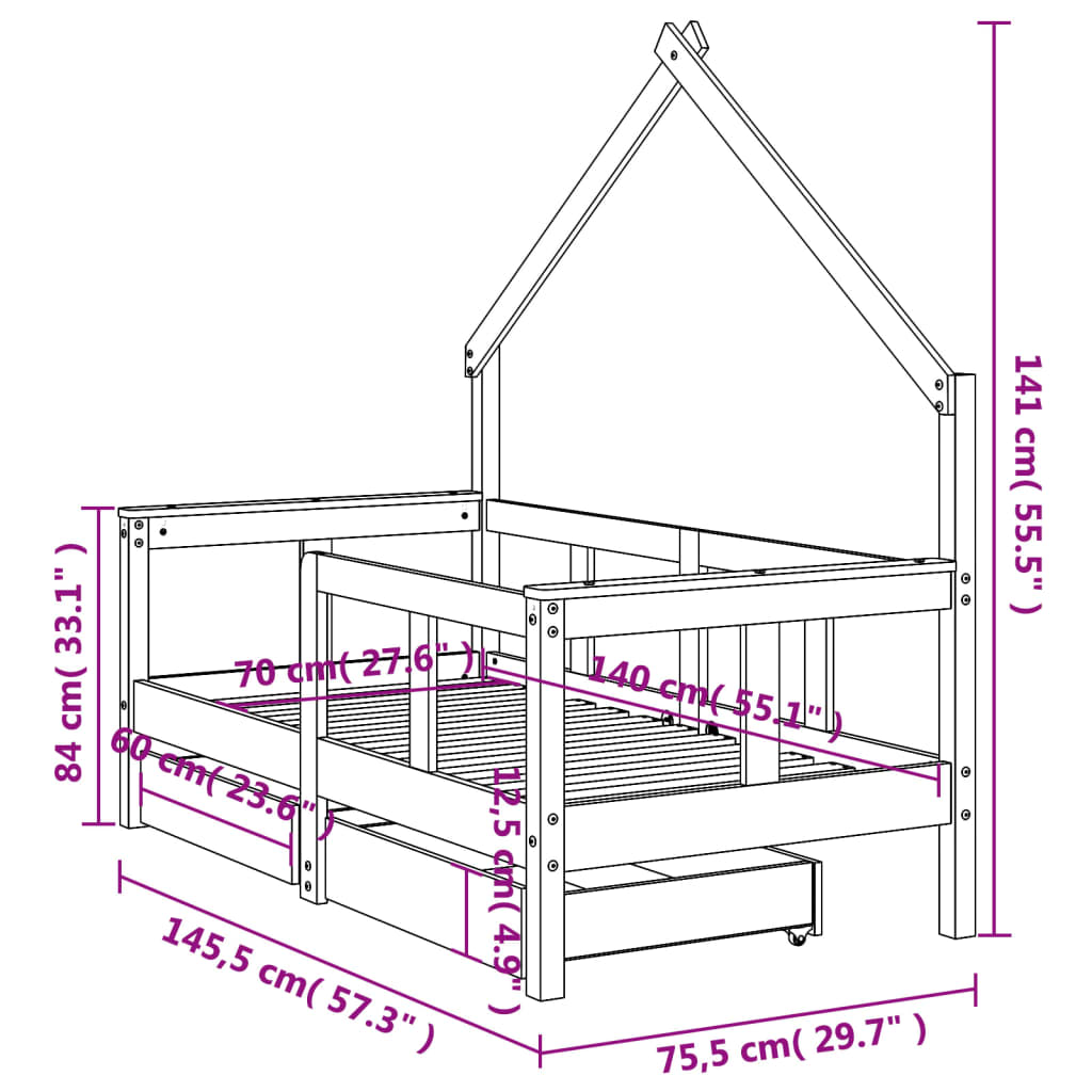 vidaXL Πλαίσιο Παιδικού Κρεβατιού με Συρτάρια 70 x 140εκ. Μασίφ Πεύκο