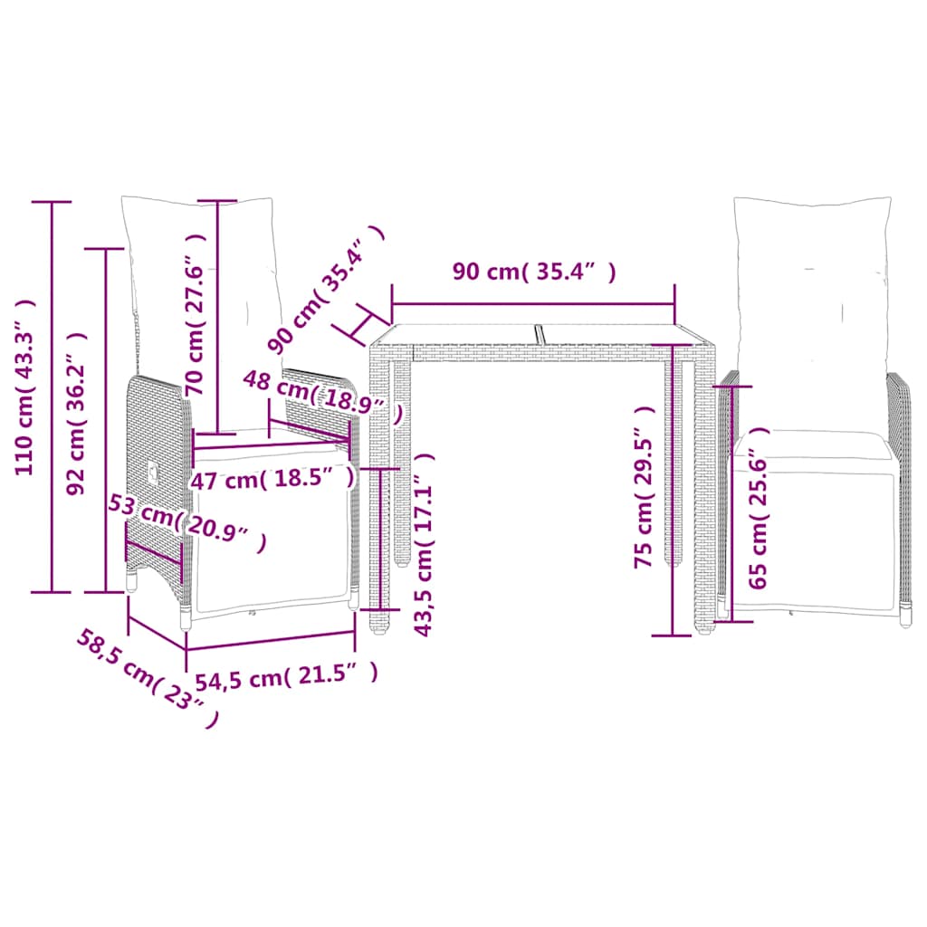 vidaXL Σετ Επίπλων Bistro Κήπου 3 τεμ Μαύρο Συνθετ. Ρατάν με Μαξιλάρια
