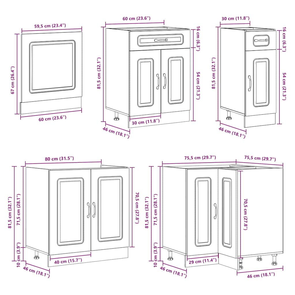 - 1 x γωνιακό ντουλάπι βάσης κουζίνας: 75,5 x 75,5 x 81,5 εκ. (Π x Β x Υ)