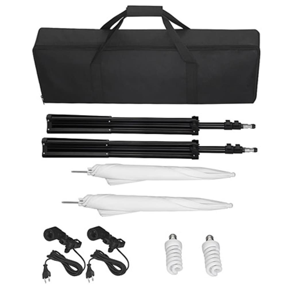 Αυτό το σετ είναι κατάλληλο για στούντιο φωτογραφίας και βιντεσκοπήσεις. Αποτελείται από ένα πλήρες σύστημα φόντου. Το σύστημα παρέχεται με ένα εξαιρετικά πλατύ φόντο λευκού χρώματος διαστάσεων 600 x 300 εκ. Περιλαμβάνεται επίσης ένα σετ φωτισμού που αποτελείται από 2 φωτιστικά daylight με ομπρέλες. Η ισχύς των φωτιστικών είναι 24 watt (με φωτιστική απόδοση που ισούται με 100 watt). Μπορείτε να ξεκινήσετε αμέσως με διάφορα είδη φωτογραφίας όπως φωτογράφιση προϊόντων.