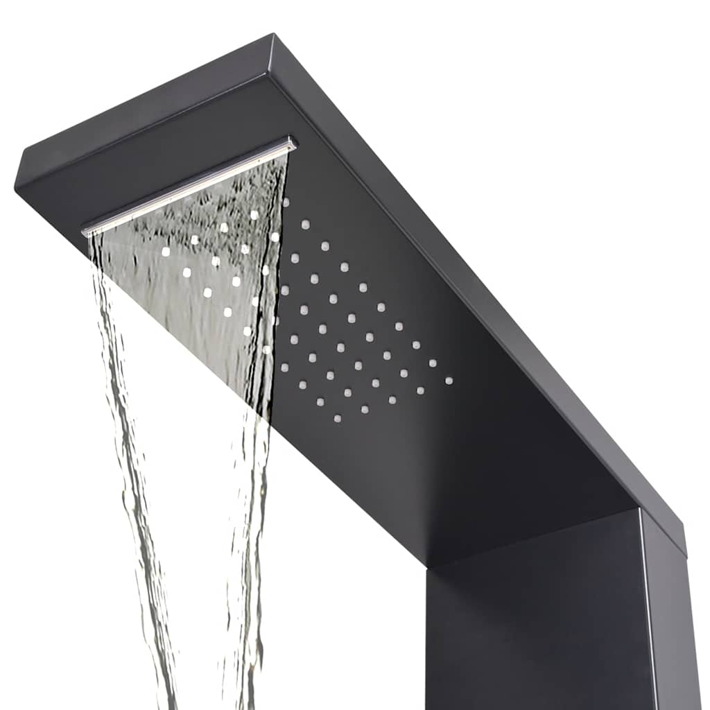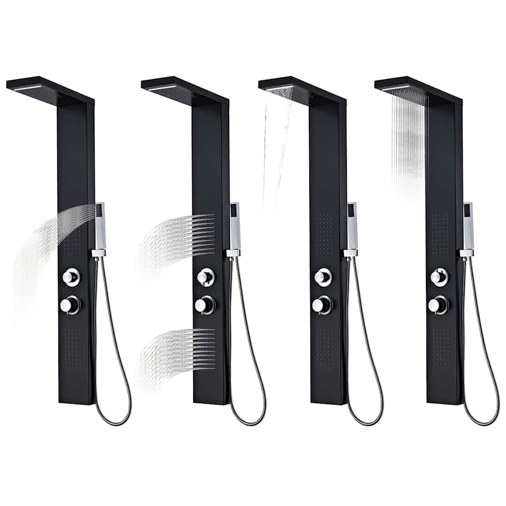 Η κολόνα ντους είναι κατασκευασμένη από ανθεκτικό αλουμίνιο με όμορφο, τετράγωνο σχεδιασμό. Διαθέτει 4 λειτουργίες: βροχή, καταρράκτης, πίδακες υδρομασάζ και τηλέφωνο χειρός, τις οποίες μπορείτε να επιλέξετε εύκολα μέσω ενός διακόπτη.