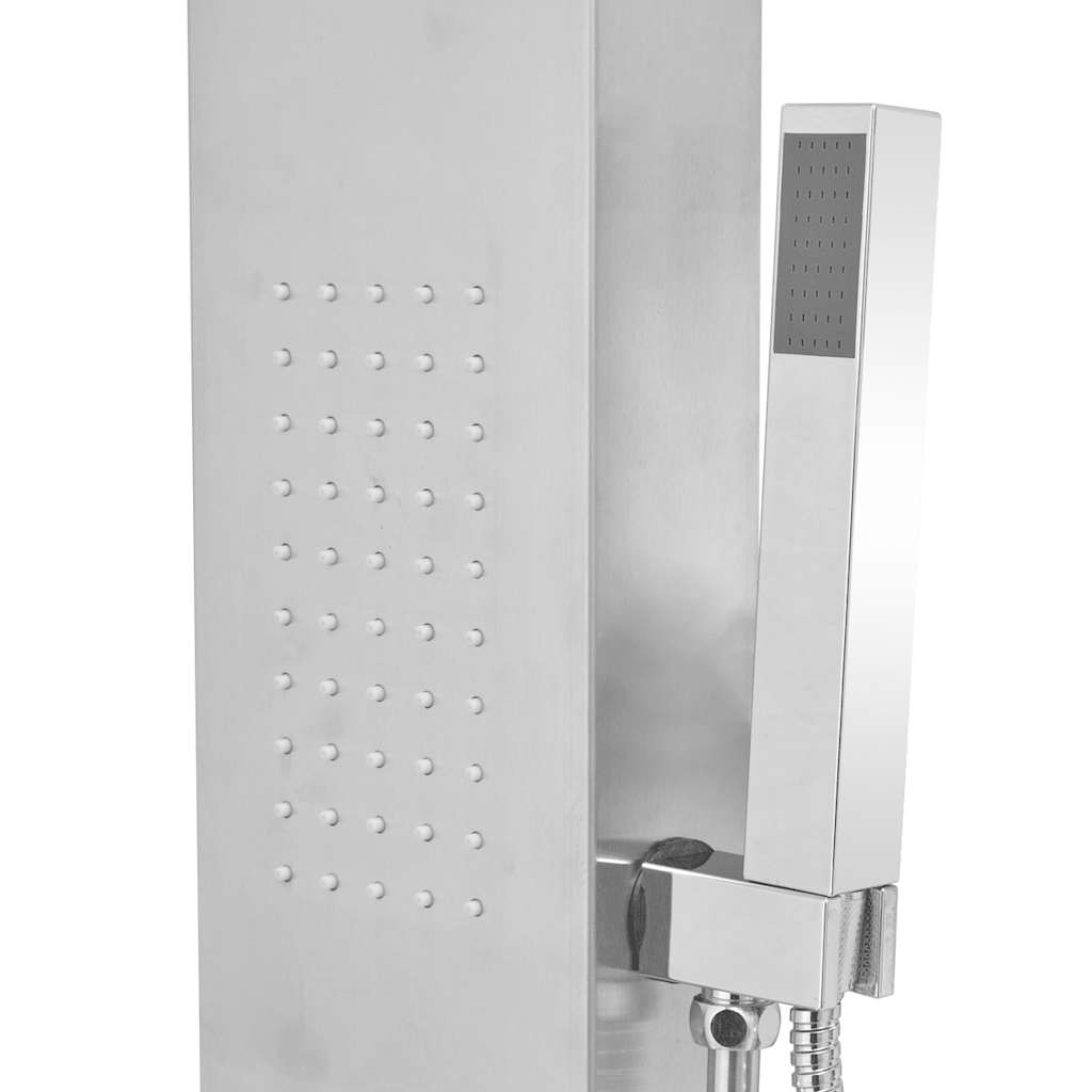 Η κολόνα ντους είναι κατασκευασμένη από ανθεκτικό ανοξείδωτο χάλυβα με βουρτσισμένο φινίρισμα και όμορφο, τετράγωνο σχεδιασμό. Διαθέτει 4 λειτουργίες: βροχή, καταρράκτης, πίδακες υδρομασάζ και τηλέφωνο χειρός, τις οποίες μπορείτε να επιλέξετε εύκολα μέσω ενός διακόπτη.